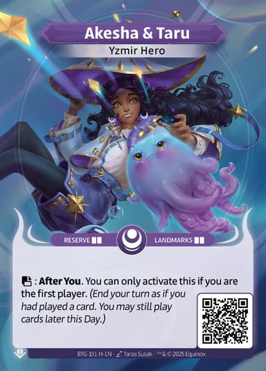 Akesha has a pretty hard ability to put a value on. It is the only hero power in the game that does not come with a tangible benefit to your gamestate – the only advantage is that you get to ensure you are the second player every single round. Many card gamers may be used to this being a bad thing – it is traditional in many TCGs to want to be the first player as often as possible. But with the way boardstates develop in Altered it is actually much better to be second most of the time. Going second means you can look at your opponent’s first 1-2 card plays and decide exactly which response is best. Maybe they play two creatures in the same lane and you can just play one in the other lane to reach parity. Maybe they play a single large creature that you can play a removal spell on. Maybe they pass earlier than expected and you now have time to play card draw spells without worrying about loss of tempo. The hope with Akesha is that you can maximize these moments where you are in control of the pace of rounds.